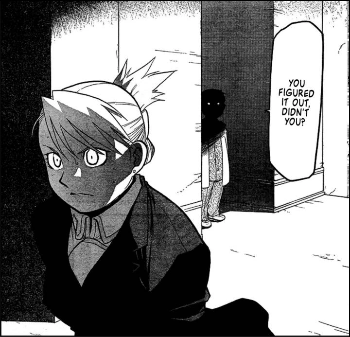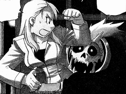 - King Bradley saying that he could "get to Mustang through 'her' (Hawkeye)", implying Hawkeye's somewhat of a weak spot of Mustang's. The Homunculi play the "Hawkeye card" against Mustang twice during the series: