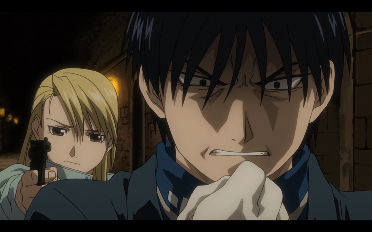 Upon his release, Mustang finds that Edward has grown very active and appearing more than necessary in the city. He follows Ed and learns of his plans to lure Scar out, as Fullmetal reasoned the Homunculi wouldn’t allow Scar to kill him. Taking advantage of the situation, Mustang and Riza help Edward by confusing the Military Police and, when the Homunculi started to appear, Riza is sent to capture one of them. She disguises herself with Fuery’s glasses and clothes and encounters Ling, who has just arrested Gluttony, picking both up with her car. However, she’s spotted by King Bradley while doing so, which leads to consequences later on.