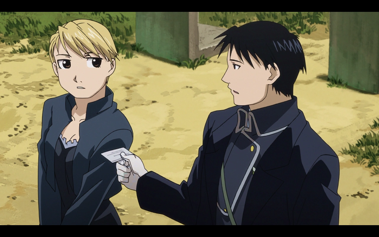 - Roy being devastated because "Elizabeth has been taken by another man" (Elizabeth is Hawkeye's codename while undercover) when King Bradley first started to take her hostage, and Edward's remark as Riza being "the perfect hostage" in that same occasion.